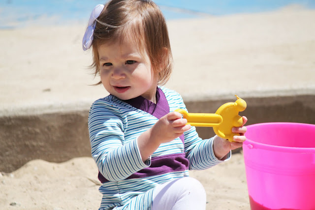 The girls looooooved the sand today. Last year they just sort of looked at it, tried to eat it, and couldn't walk or crawl in it because they weren't very stable. This year, however, they were dumping pails, and filling them up. Magda even met a little boy she got along with very well.